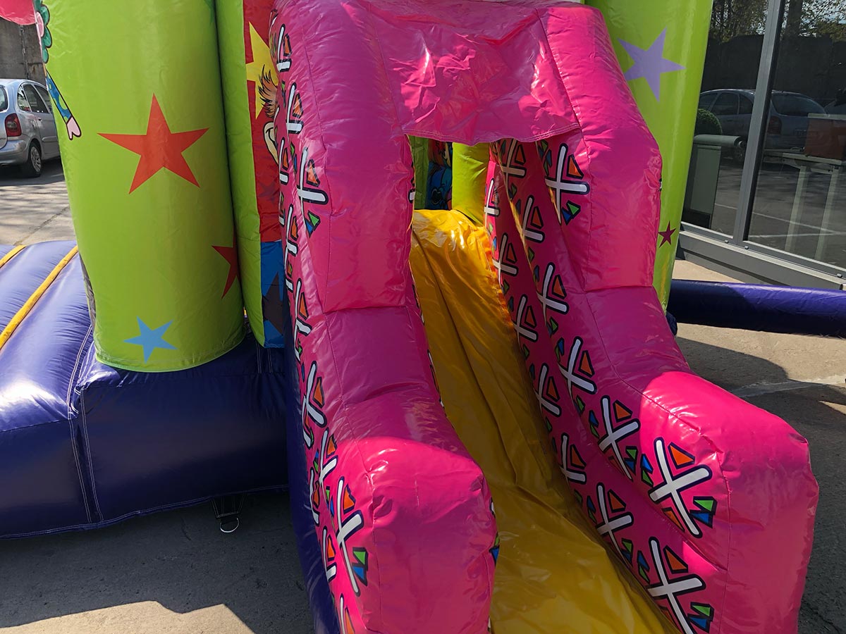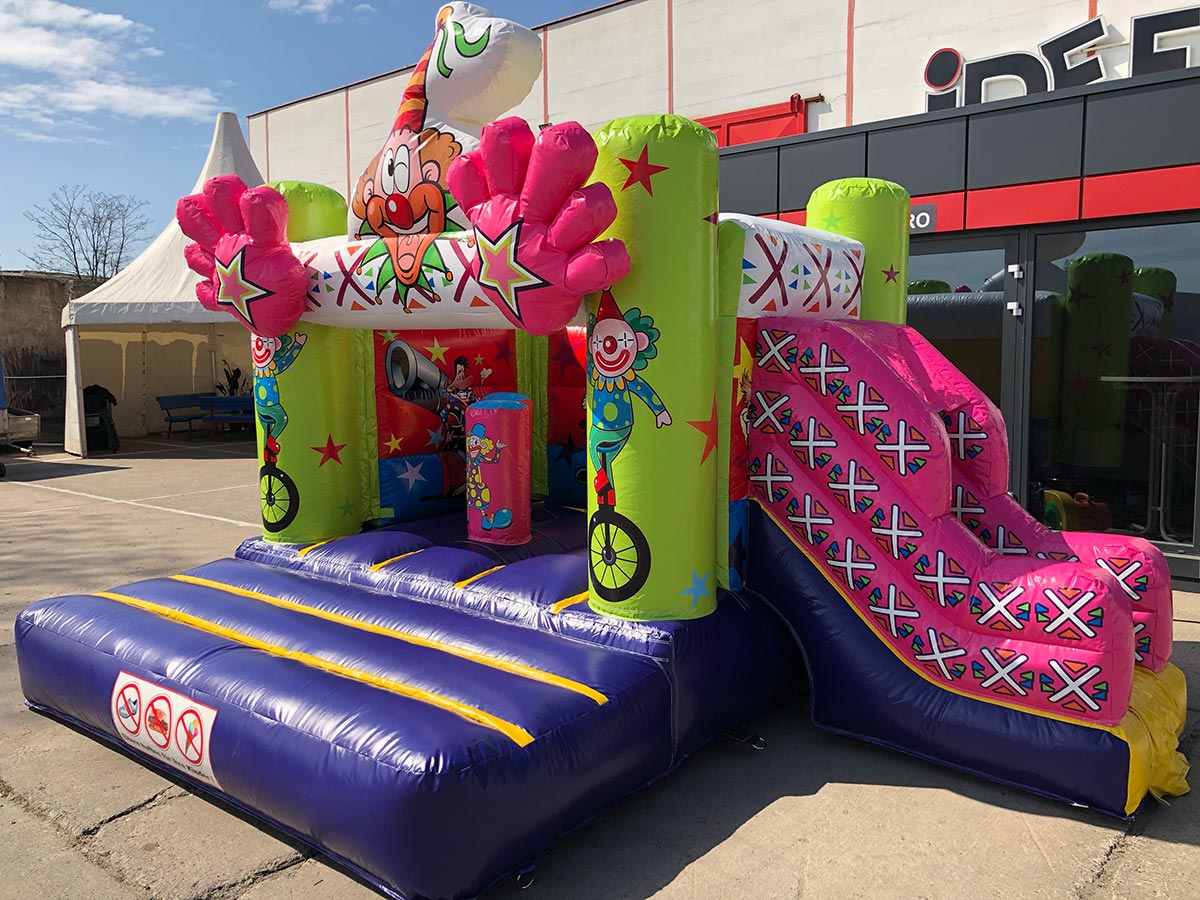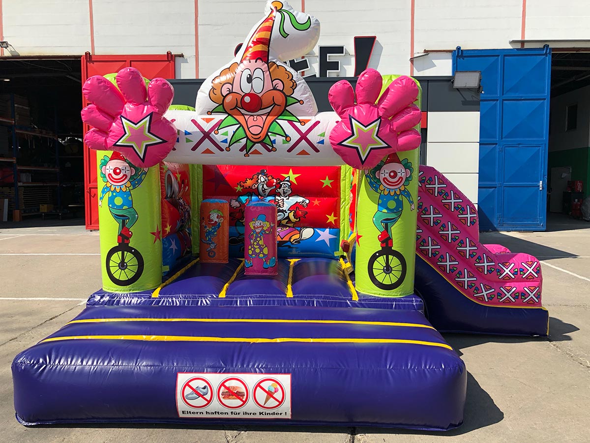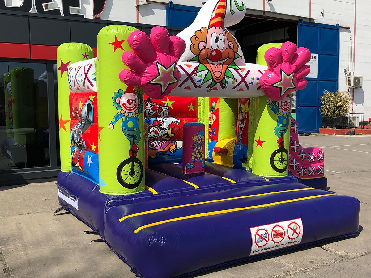 Vorhang auf, Manege frei! Unsere farbenfrohe Zirkus-Hüpfburg bringt das fröhliche Flair eines echten Zirkus direkt zu deinem Event. Bunte Clowns, lustige Motive und die beiden großen Zirkushände am Eingang sorgen schon beim ersten Blick für strahlende Kinderaugen. Mit ihrer fröhlichen Gestaltung und der seitlich integrierten Rutsche wird diese Hüpfburg zum absoluten Lieblingsplatz auf jeder Veranstaltung.